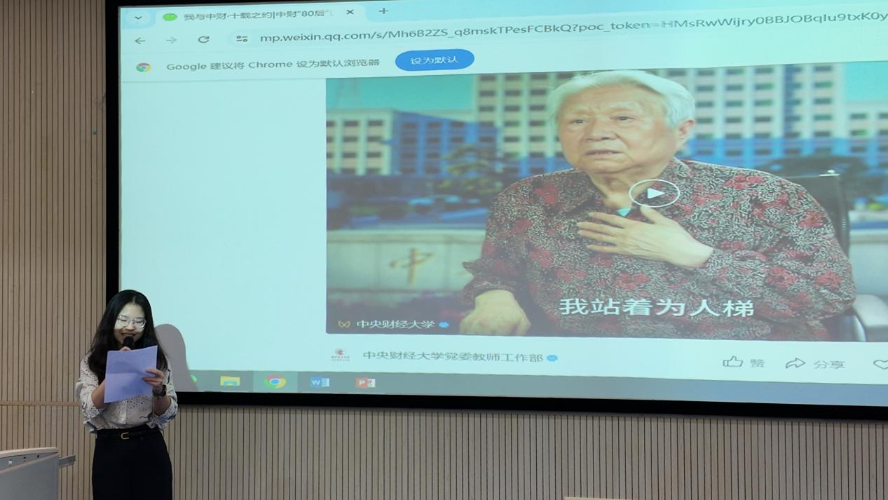 顾雷雷副院长介绍了王老师的优秀事迹:王巾英教授是中央财政金融学院(现必赢3003no1线路检测中心)二级教授、博士生导师,我国著名市场营销与涉外经济管理专家、财经教育家,市场学本土化拓荒者。她的多部著作获评优秀教材,填补了中国高校市场学教材的空白,创建了国内市场学课程体系。她以“为人梯、为人桥、为人路”的师者担当,照亮无数学子的成长之路。