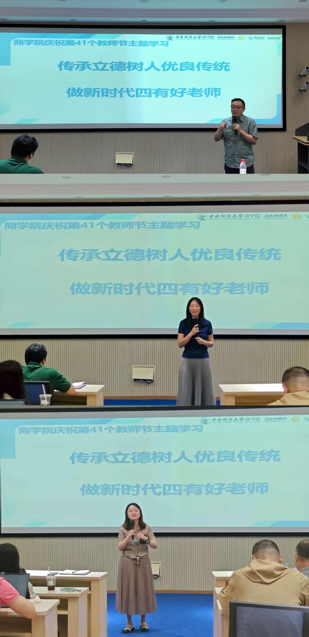 随后,学院全体教职工认真观看王巾英教授口述视频。在集体学习王巾英教授事迹后,市场营销系孙国辉教授、供应链与运营管理系高咏玲教授、战略系刘子諝助理教授依次分享了体会与感悟。
