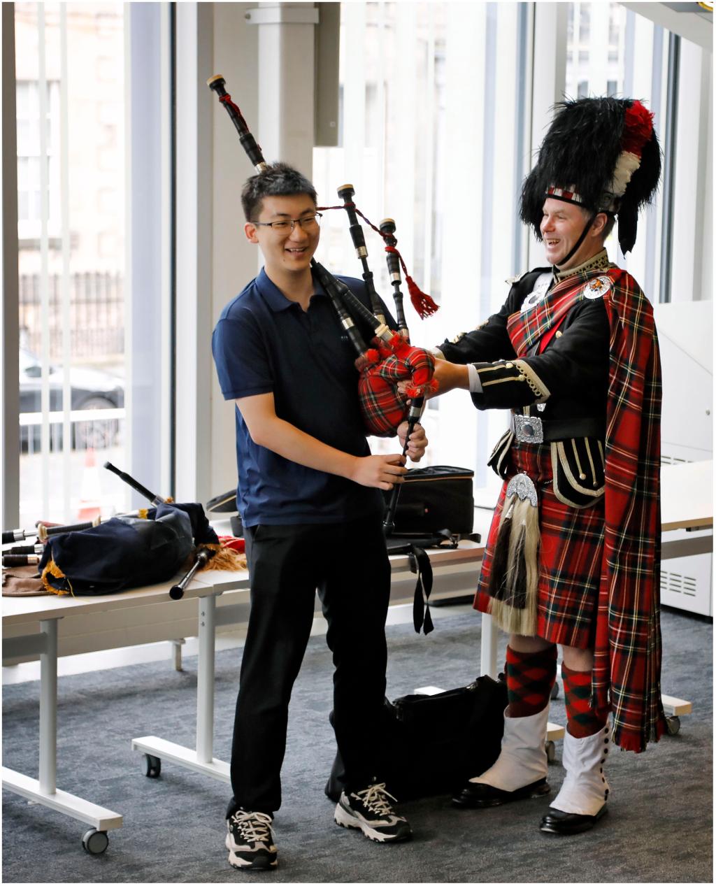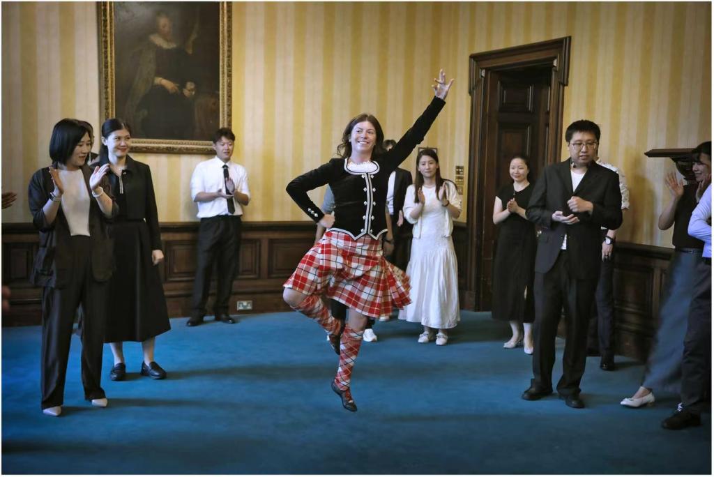 而在圣伦纳德书院举办的欢迎晚会上,学子跟着乐手的节奏学习苏格兰传统舞蹈,沉浸式体验苏格兰民俗;在苏格兰传统乐器风笛体验环节,师生在风笛手的耐心指导下,尝试握住风笛管、感受气息与旋律的配合,尽管初次尝试略显生涩,却在互动中真切触摸到苏格兰文化的灵魂。