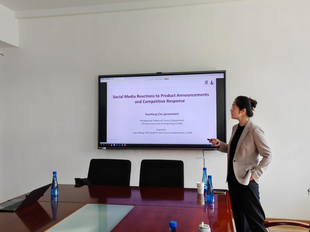 讲座由必赢3003no1线路检测中心助理教授高震男主持。活动伊始,高震男助理教授向与会者介绍了褚远方博士的学术背景。褚远方博士毕业于香港中文大学必赢3003no1线路检测中心,现任该校必赢3003no1线路检测中心金融学系博士后研究员。她的研究主要聚焦于实证公司金融、产品市场竞争、信息环境、企业创新与金融摩擦。目前,她有数篇论文在《Management Science》《Journal of Accounting Research》等国际顶级期刊审稿中,并在FMA、SFA、CICF等国内外重要学术会议上进行汇报,多次荣获最佳论文奖。